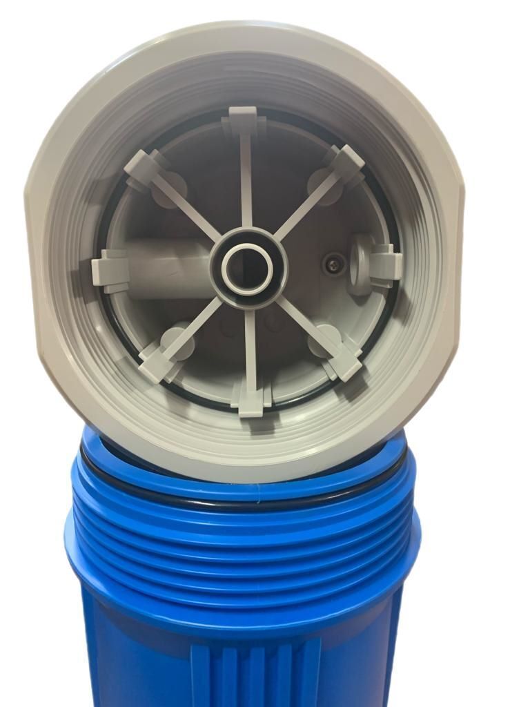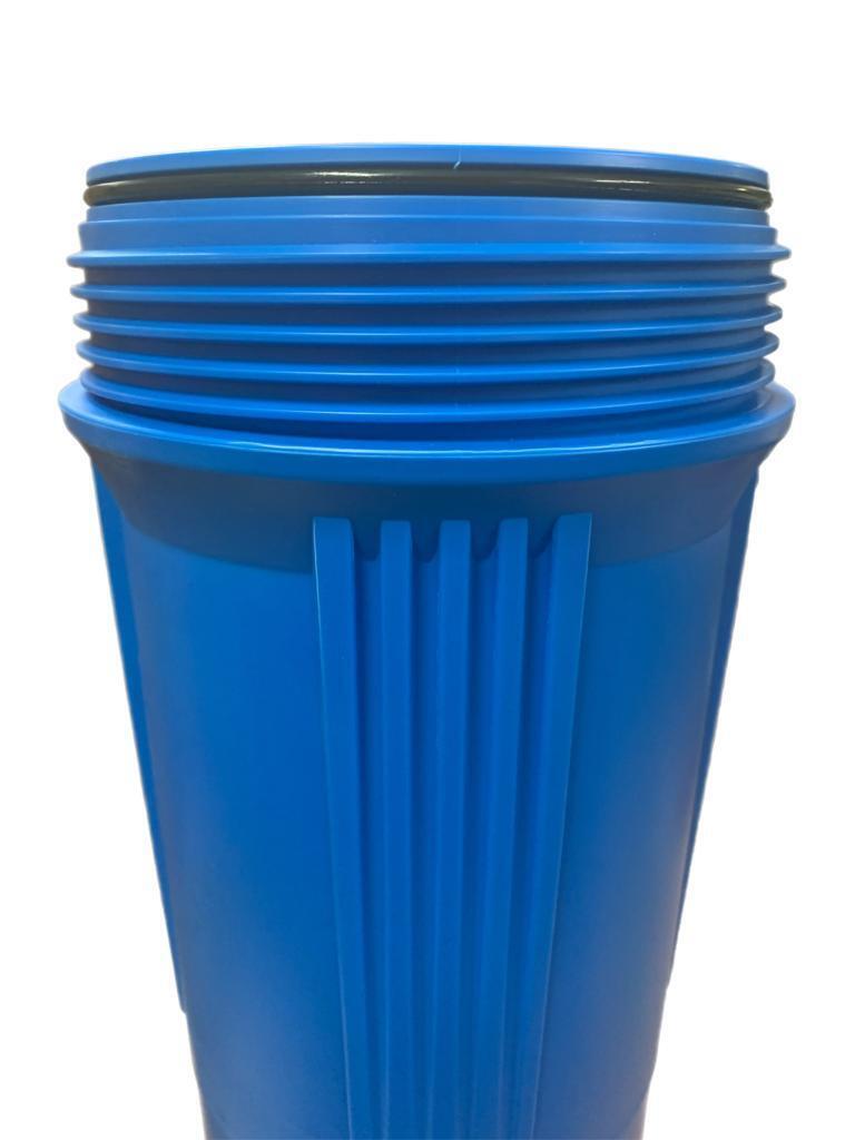 Large diameter 20" BLUE Filter Housing with 1" BSP in/out Ports with a flow rate of 1200 to 1800 lts/hr depending on the filter being used and the level of contaminants, with an operating pressure of up to 150 psi (10.34 bar) and Max. operating temperature of 40 deg.C.