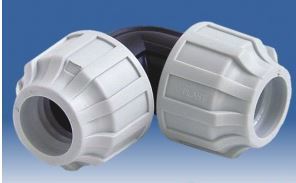 90° Elbows for MDPE pipe comprising of an acetal grip ring and Nitrile rubber O ring. They have a pressure rating of 16 bar at 20° C, and a maximum service temperature of 80° C (NB at reduced pressure). A competitive alternative to notable brands such as Philmac, Plasson and Polyfast.
