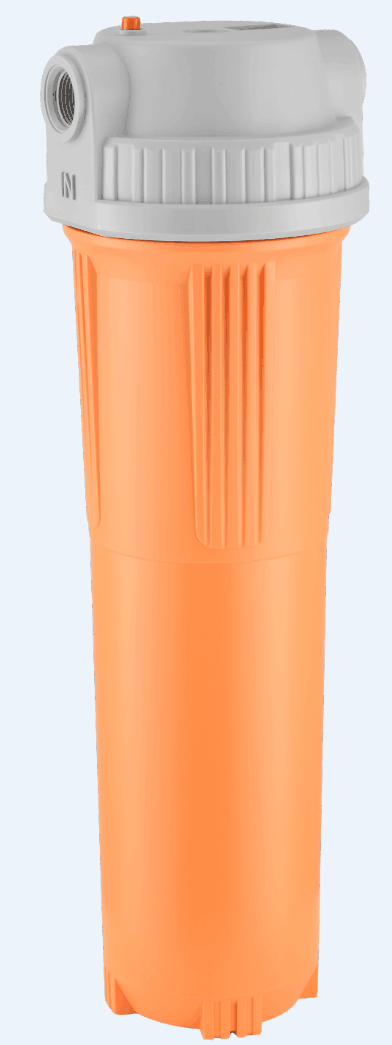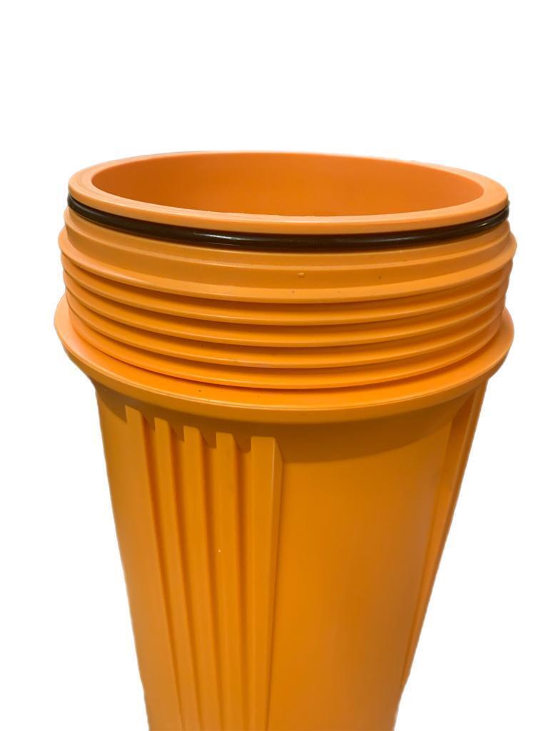 Large diameter 20" ORANGE Filter Housing with 1" BSP in/out Ports with a flow rate of 1200 to 1800 lts/hr depending on the filter being used and the level of contaminants, with an operating pressure of up to 150 psi (10.34 bar) and Max. operating temperature of 40 deg.C.