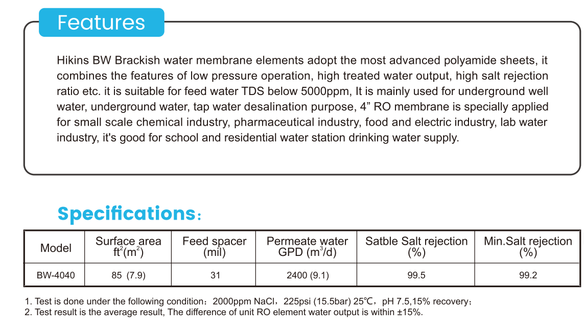 BW-4040 Reverse Osmosis Membrane, high operating pressure 15.5 bar